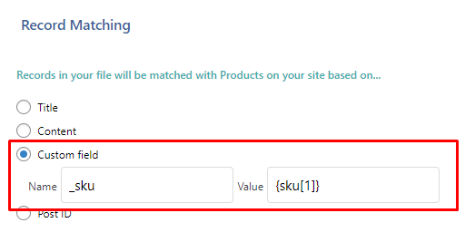 - Set how WP All Import will identify a product. In this example, we would use the EposNow SKU field to match to the Woo SKU field, update this to reflect your matching criteria.