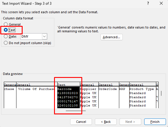 - Select the columns which have leading zeros (e.g. barcode) and set the Column data format as Text.