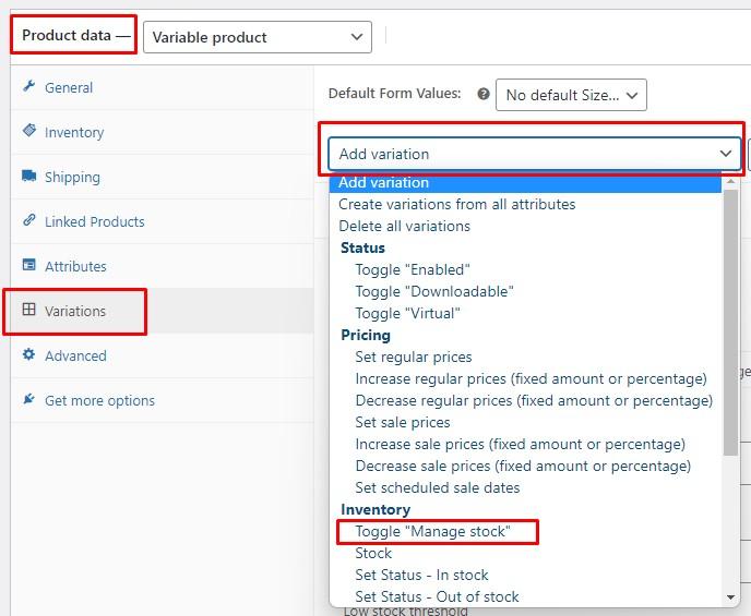 PRO TIP: You can toggle the manage stock checkbox for all variations in the product by clicking on the add variation dropdown and selecting the toggle manage stock option from the list.