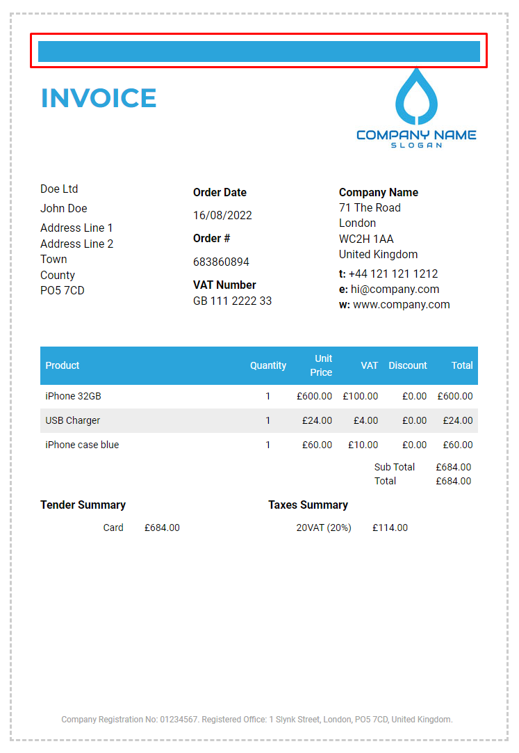 If wish to print from an Android till, we suggest that you add a spacer at the top of your template in our template editor to avoid any overlap with the blue block.