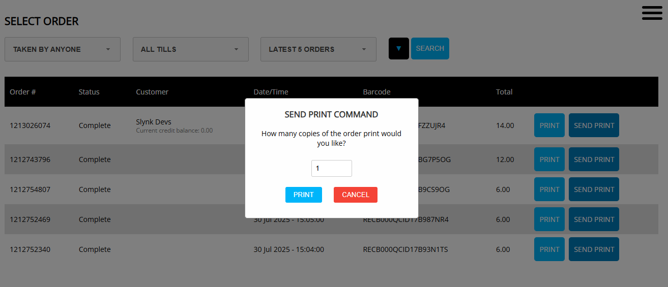 On the orders list, you will now see a Send Print button. Click this to send the order print command to Epos Now.